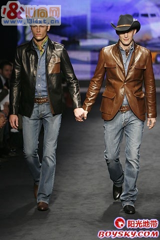 与上世纪70年代的牛仔形象不同,《断臂山》式牛仔是“古典而温情的”。你能在2006秋冬米兰男装周上找到众多牛仔元素——或者是一条颈巾、一顶牛仔帽,又或者是一条牛仔裤、一双牛仔靴。