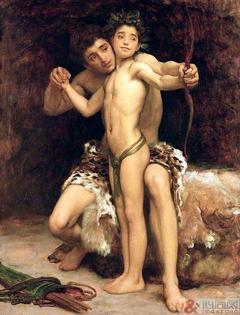 二少年,大的教小的怎么射。前者羞涩,后者甜腻,毕竟是太小,射不出来,箭筒还在地下呢。然而知道动作要领就好,等长大了,箭筒背在身上了,再射不迟。再看弓,无弦。无弦之射,意境所在。好啦你们别意淫,其实雷顿的意思在情感。少年之爱。任何人,尤其是GAY,总得经历这么一个少年,教你学打枪,教你学射箭,教你怎么叫做,爱。