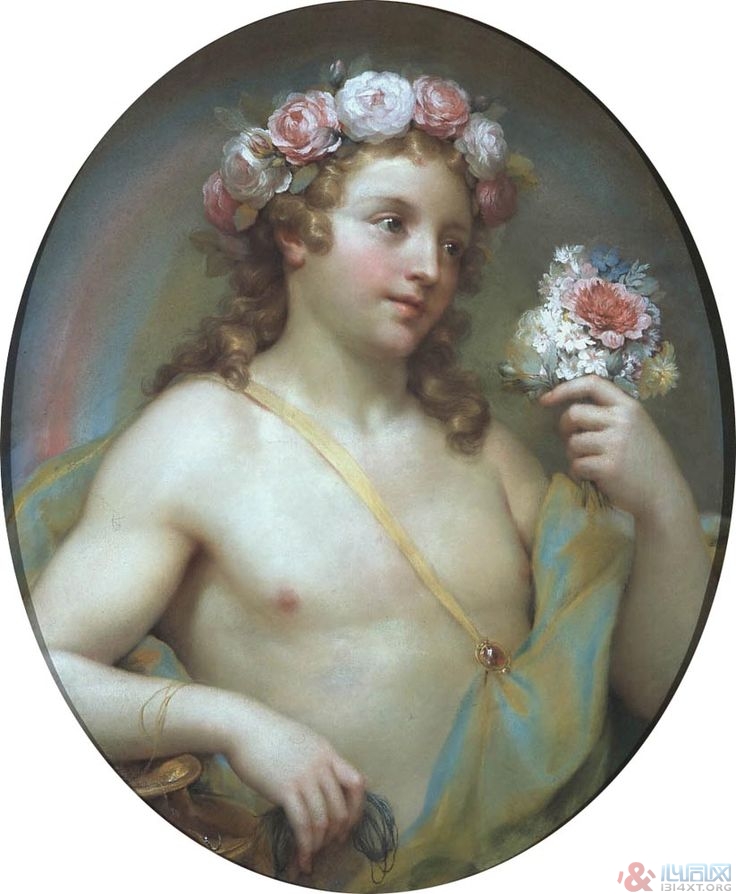 安东·拉斐尔·门斯是新古典主义的大师,新古典主义,就是学院派加古典派再加宫廷派,这就好比乳里加了酪又加了醍醐,完美是完美,矫情也矫情。画中人是快乐,pleasure,快乐就该是少年模样。快乐的颜色,就该是明快得有些轻浮。快乐的味道呢,花香,花香无疑。然而门斯究地没有希腊人畅快,喝酒就喝酒,做爱就做爱,门斯以为的快乐,是内心的。快乐,似乎都该有个天蓝色背景。君子之乐甜如蜜而淡如水,是门斯的意思了。