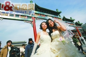 ■一对「女同志」穿上婚纱在北京闹市拍摄结婚照。(图文出自2月15日香港《文汇报》) 吁宽容 同性恋情侣前门拍婚纱照 现场派送玫瑰,呼吁社会给予关注和接纳 情人节的中午,两对盛装的同性恋情侣在前门步行街拍摄婚纱照,并和其他同性恋朋友一起向路人赠送玫瑰。参与的同性恋情侣称,希望通过公开拍摄同性结婚照的形式,推动社会对同性恋群体的关注和接纳。 昨日13时许,前门大街正阳门牌楼下,身着礼服的男同性恋小张在摄影师的安排下抱起了身边的爱人,深情相吻。一旁的女同性恋小韩与爱人着白色婚纱,正在寻找合适的拍摄地点。过往的游客被这两对特殊爱人吸引。 多数游客对同性恋者表示尊重。游客陈女士称,她能够理解同性恋者,并且尊重同性恋爱人的选择,她希望民众都能够用正常的眼光看待同性恋。