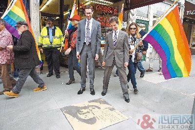 旧金山同性恋大本营卡斯特罗街(Castro Street)为了纪念争取非异性恋者(LGBT)权益的先驱,在市场街至第19街的两个街段人行道上,镶入20幅纪念牌。这条“彩虹名人大道”(Rainbow Honor Walk)于2日揭幕,象征卡斯特罗区和同性恋者权益运动进入新纪元。