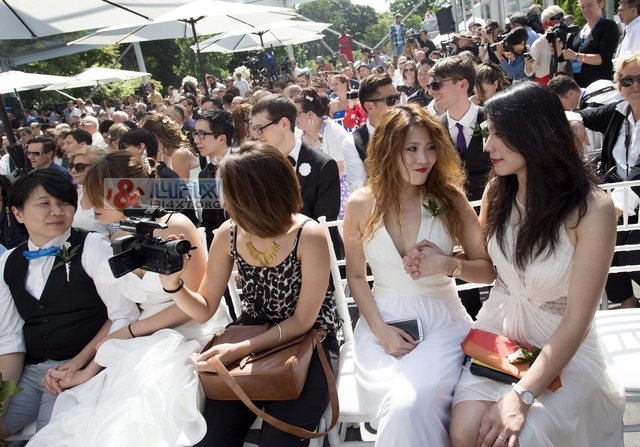 来自台湾的Cindy Su 及Lana Yu在多伦多举行结婚典礼家人还不知道。她们在接受访问时表示,台湾还没有同性恋婚姻法,因此她们极羡慕加拿大,决定来这里结婚。