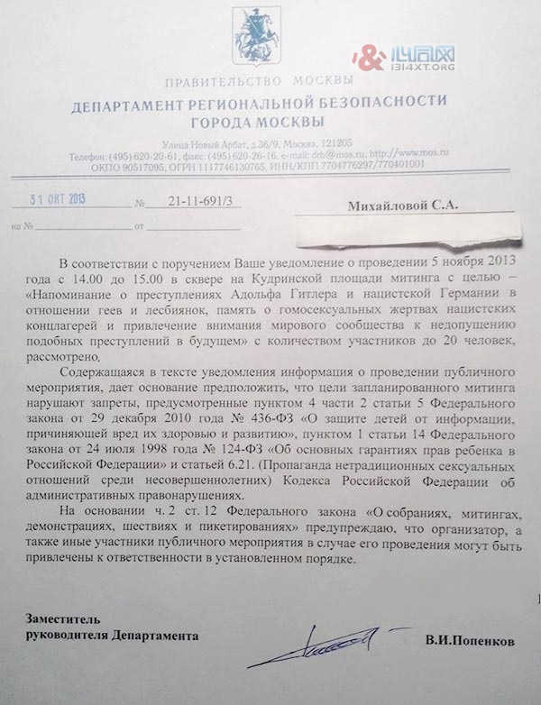 10月31日,活动筹办人提交的申请被莫斯科当局拒绝,相关文件称在广场上纪念同性恋受害者,很可能会把现场或附近的儿童“影响成”同性恋。