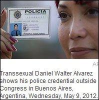 阿根廷一变性人在首都国会外出示警员身份证明(网页截图)