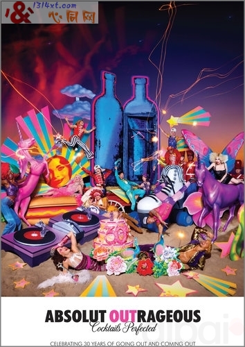 Absolut为进入美国同性恋市场30周年而推出的宣传海报,海报上有标题语“Absolut Outrageous”,还有宣传语“Celebrating 30 years of going out and coming out”(大意:庆祝走出去和站出来(出柜)的30年)。