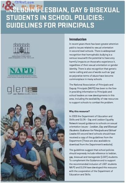 5月30日,爱尔兰政府的教育部推出了支持同性恋倾向学生的学校校长政策指南,该指南将帮助学校应对恐同欺凌等问题,同时指导学校在管理政策中包容同性恋和双性恋的学生。 支持同性恋学生的官方校长指南是首次在爱尔兰推出。爱尔兰教育部长鲁埃里-奎恩(Ruairi Quinn)在本周一的新指南发布讲话中说,二十一世纪的学校应该为所有的学生提供安全和支持环境,包括同性恋、双性恋和跨性别学生。 曾担任爱尔兰财政部长以及工党主席的奎因还说,他正考虑成立旨在消除校园恐同欺凌现象的全国工作组,由教育部的相关机构以及有关的民间组织共同参与制定行动措施。 新的校长指南题为《在学校政策中包容同性恋、双性恋学生:校长指南》,该指南由爱尔兰的教育部、全国校长联合会(NAPD)和同性恋者平等网络组织(GLEN)共同编写,指南建议学校政策应明确包含关于同性恋、双性恋和跨性别者的表述,并制定应对恐同欺凌的具体措施。 在爱尔兰的调查研究发现,同性恋倾向、或被他人认为是同性恋的青少年学生在学校里受到恐同欺凌的问题相当严重。新发布的校长指南也在前言中指出,带有歧视和恐同意味的称谓,例如以贬义使用词语“gay”(同性恋)等现象,在校园里非常普遍。