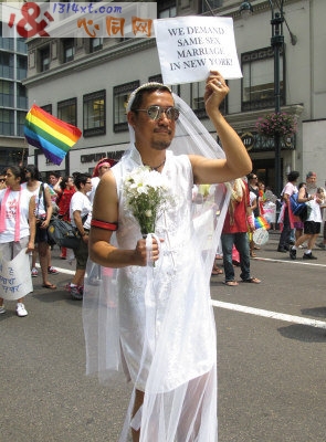 据美国《世界日报》报道,纽约市当地时间27日举行一年一度的同志大游行,350个团体近50万人参与了这一次盛事。今年亚裔方阵非常醒目,包括亚太裔艾滋病联盟等均参加游行。亚裔同志们也一改含蓄态度,勇于表达自我,并分发保险套以推行安全性行为。 游行队伍和花车从曼哈顿39街开始沿5大道行进至格林威治村。州长帕特生、联邦参议员陆天娜、市长彭博和市议长柯魁英等为游行开道,州检察长葛谟、市主计长刘醇逸与州主计长狄纳波利(Thomas Dinapoli)也出席。 因公开同性恋身份而被迫退役的伊战退伍陆军中尉崔丹尼尔(Daniel Choi)被选为今年的游行总指挥(Grand Marshall)之一。 打头阵的上百辆同志伴侣驾驶的摩托车呼啸而过,迅速点燃围观民众的热情,其次是巨大气球组成象征同志的彩虹队伍。随后有来自市警总局、消防局和各地区的同性恋支持队伍。不少花车上都站着清凉打扮的同志,他们随音乐热舞,所到之处引起一片尖叫声。 亚裔队伍由巨大的彩虹字幅“Asian Pride”打头阵,数十人演奏亚洲乐器,吸引民众注意力,紧随其后的是专门为亚裔女同志设立的Q-Wave团体。“亚太裔艾滋病联盟”(APICHA)主打“免费HIV检测”计划,近百位身穿红色T恤的成员们手举标语,向沿路民众分发安全套。 很多亚裔同志勇敢展示自己,其中不乏华裔身影。一位身穿结婚礼服的亚裔男同志,手举“要求纽约承认同性婚姻”的牌子,表达了同志们的呼声。也有不少同志的支持者参加游行,梁淑仪支持身为女同志的姐姐梁淑安一起来游行,当义工的刘健行和刘素夫妇表示有很多同志朋友,大家都是一样的人,没有什么不同。