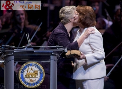 1月4日,美国得克萨斯州休斯顿市的新市长安妮斯-帕克(Annise Parker)女士正式宣誓就职,这也意味着休斯顿这座美国第四大城市第一次有了一位公开为同性恋者的市长。 帕克是在去年12月12日竞争激烈的选举中击败对手,当选为休斯顿的下任市长,她的当选成为去年得克萨斯州甚至全美国的同性恋者争取社会认同和平等权利的一次重要事件。在本周一的公开就职仪式前,帕克实际上已于周末在一个内部小型仪式上宣誓就职。 周一的正式公开就职仪式有一千多人参加,53岁的帕克手按《圣经》,在一位联邦法官的主持下宣誓,而在场为帕克手捧《圣经》的人就是她的同性伴侣凯西-哈巴德。帕克与凯西还在就职台上亲吻,手拉手向与会者致意。 帕克在就职讲话中说,她能感受到休斯顿的同性恋者社群为她当选所表达出的兴奋欢腾的心情,她的当选对当地同性恋者群体来说也是具有重要意义的事件,但这只是朝更公正的明天而迈出的一步。 安妮斯-帕克与同性伴侣在1月4日的就职仪式上: