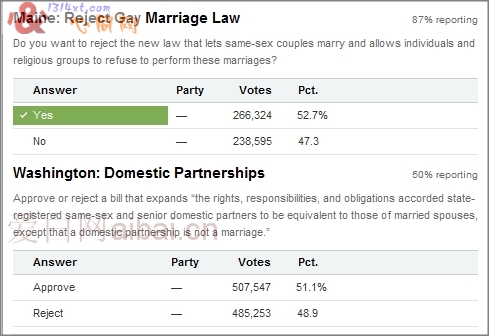 爱白网讯 美国的一些州在11月3日分别就各种不同议题举行了全民投票,根据最新的计票结果,缅因州承认同性婚姻的法律被推翻已成定局。对于美国的同性恋者争取平等权利团体和人士来说,这一结果将是继加州八号提案投票之后又一次不小的挫折。 缅因州承认同性婚姻的法案于今年5月6日在州议会参众两院最后获得通过,州长巴达奇随即在当天签署了这一法案,法律原定于今年9月生效。但赶在法律生效之前,一些反对同性婚姻的团体征集到了法定数量的支持签名,将同性婚姻议题定为11月3日全民投票的内容之一,使得有关法案暂停生效。 在本周二的全民投票进行前,缅因州支持和反对同性婚姻的团体各自发起了宣传拉票攻势。此前,在美国其它31个州已经进行的类似的全民投票的结果,都是不承认同性婚姻。支持同性恋者平等权利的团体曾希望这一状况会在缅因州有所改变。 目前已经被统计的87%的缅因州选区票数显示,赞成推翻同性婚姻法律的票数占52.7%,反对者占47.3%,同性婚姻法律被推翻已成定局。 另一方面,在华盛顿州,关于同性伴侣平等权利法案是否有效的“71号公投”也在本周二进行。由华盛顿州议会通过的有关法案给予同性恋伴侣与异性婚姻配偶几乎同样的法律权利,两者仅名称不同。由于遭到部分人的反对,已由州长签署的同性伴侣平等权利法案不得不由华盛顿州选民投票决定是否有效。 据最新的计票结果,在已经统计的50%的选区票数中,赞成同性伴侣权利法案的票数占51.1%,反对该法案的票数占48.9%,法案可能将在本次公投中获得通过。