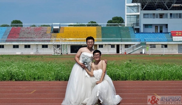 男穿婚纱扮新娘女扮新郎 大学生拍婚纱毕业照