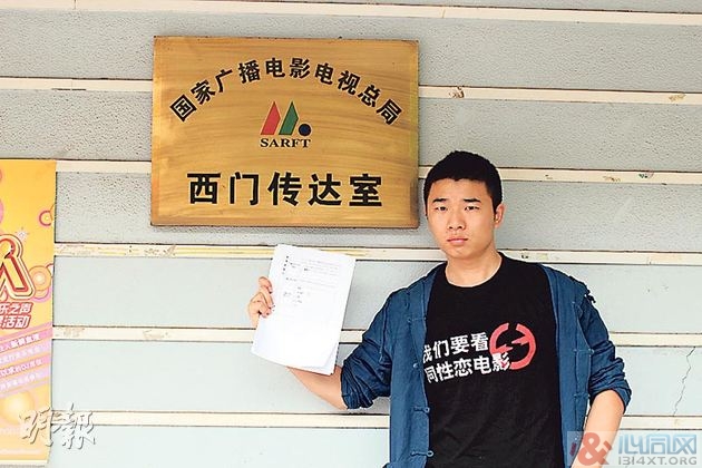 身穿“我们要看同性恋电影”字样衣服的范坡坡昨午到达广电总局,提出信息公开诉求。范坡坡对本报表示,原国家广电总局2008年颁布的包含同性恋禁令的《关于重申电影审查标准的通知》已于2010年被新规取代,但却未公开发布。他呼吁当局明确公开同性恋题材电影的审查状态。总局传达室以“联系不上该处理的部门”为由,要他以邮寄投诉。按照规定,该局需在15个工作天内答覆。
