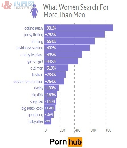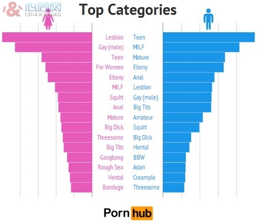 Pornhub与Buzzfeed合作,对上成人片网站的观众做出一系列分析。其中男女性在对成人片的选择上,男性不算很意外的~最喜欢的种类是“青少年/少女”,之后是“辣妈”和“熟女”,但女性的第一名是“蕾丝边”,之后是“同志”,第三名则是“青少年/少女”,所以说女性比较喜欢看同性做爱...做的事?