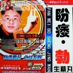 艺人的名字谐音被用来当成商品打广告的例子不少,最近又有一位艺人成为“苦主”,而且可能是最“杯具”(悲剧的谐音)的一例,照片显示一张潘玮柏学生时代的旧照,举高了食指,产品叫“盼痿.勃”生精丸。 平面媒体报道,潘帅所属的巨室经纪公司表示,这个广告确定侵犯肖像权,已请香港律师进程,研究赔偿问题。不过,潘玮柏本人倒是幽默看待,笑说:“看来大家对我的下体比较感兴趣,基於男性尊严,我引以为傲,站在人性立场却很害羞。” 其他艺人姓名谐音被大陆或香港拿来当广告的例子也不少,例如谢霆锋“被代言”泻药“泻停疯”,张惠妹“被代言”泻药“蟑会灭”,莫文蔚“被代言”除臭剂“莫闻味”。