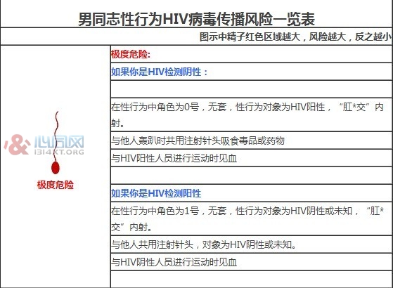 在男同志的同性性行为中,究竟哪些动作对于HIV病毒传播是“高危”的呢?是不是做0号真的更容易感染艾滋病呢?对于已经罹患艾滋的同志们,哪些性行为会导致艾滋病更大规模传播呢?请看下面这个《男同志性行为HIV病毒传播风险一览表》: