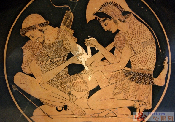 古希腊陶器彩绘:阿喀琉斯为“密友”帕特罗克洛斯的手臂绑绷带